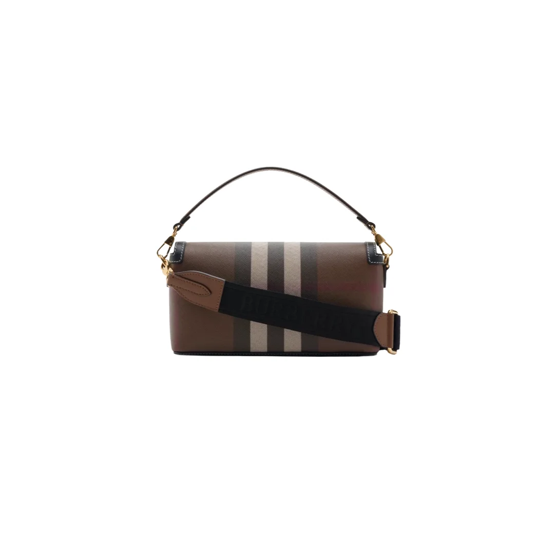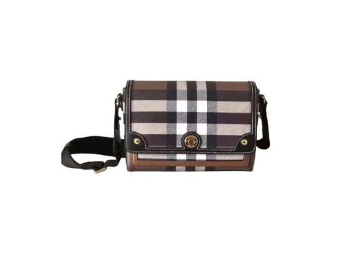 Classic Burberry Note Crossbody Bag Dark Birch Brown with Iconic Check Print and Leather Trim