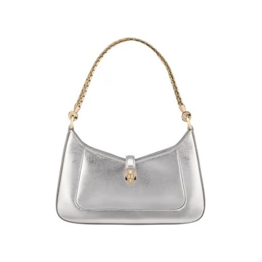 Crafted with silver Serpenti Baia shoulder bag brings a fresh, modern twist to Bvlgari’s iconic Serpenti design. The striated calf leather features a subtle metallic sheen that makes it stand out beautifully in both natural and evening light.