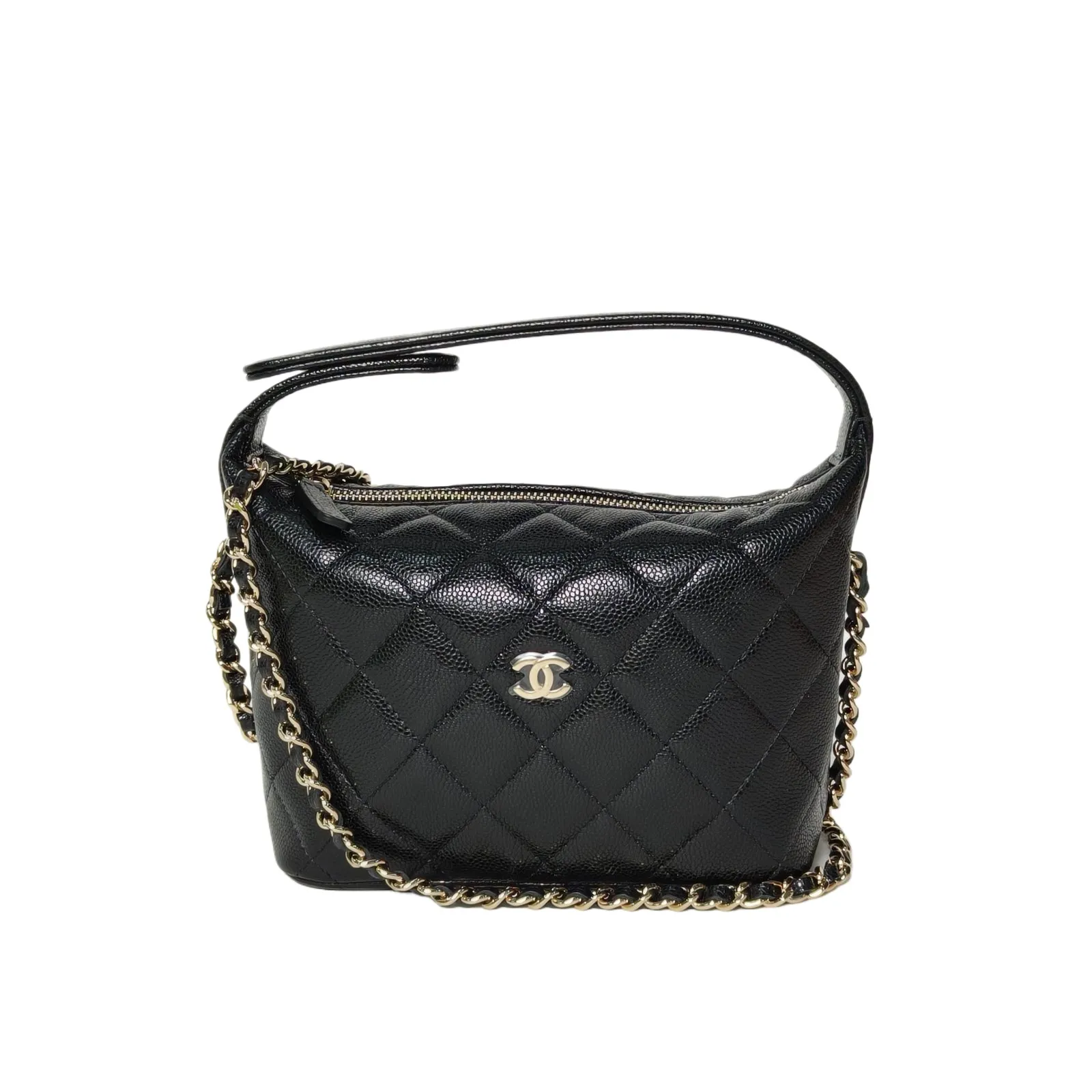 Meet your new go-to luxury essential, the CHANEL Caviar Quilted Hobo Clutch with Chain in Black. Crafted from durable grained calfskin (signature caviar leather), this mini bag combines timeless elegance with modern flexibility.