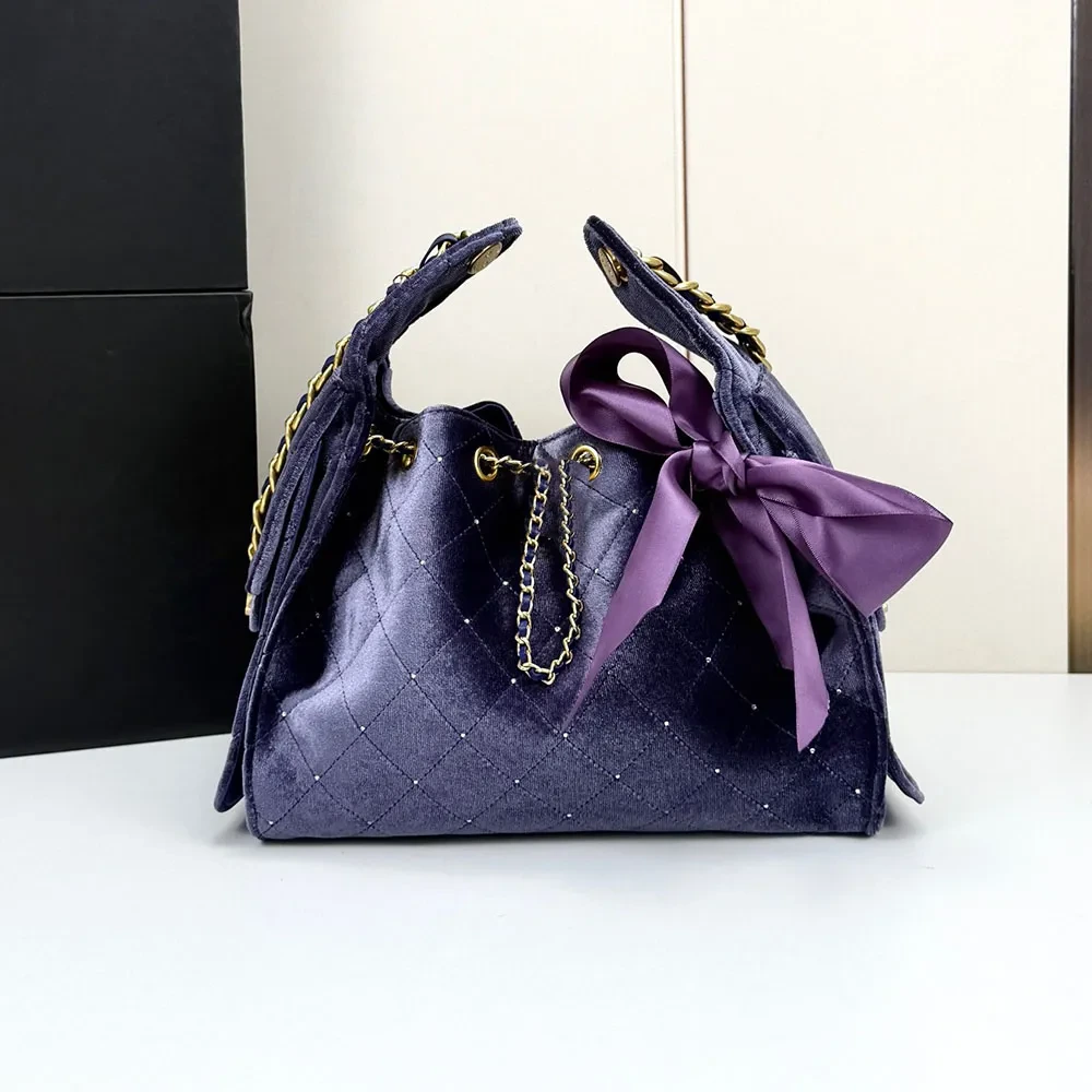 Chanel Velvet Quilted Drawstring Bucket Bag with Chain, Stylish Designer Women’s Hobo Bag