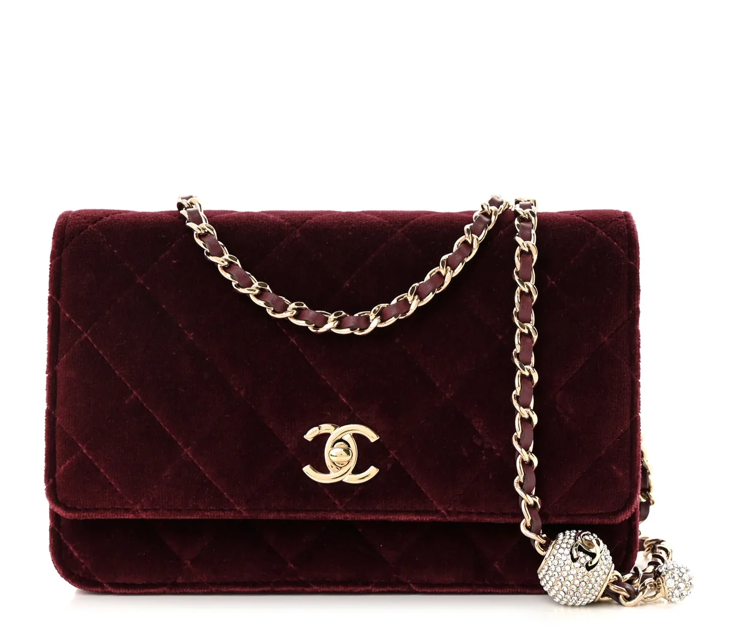 Step into timeless luxury with this authentic CHANEL Velvet Quilted Pearl Crush Wallet On Chain. Crafted with refined quilted velvet and polished gold-tone hardware, this bag instantly elevates any outfit. Its adjustable chain-and-leather strap ensures a comfortable crossbody fit, while the signature CC turn-lock opens to a thoughtfully designed interior.