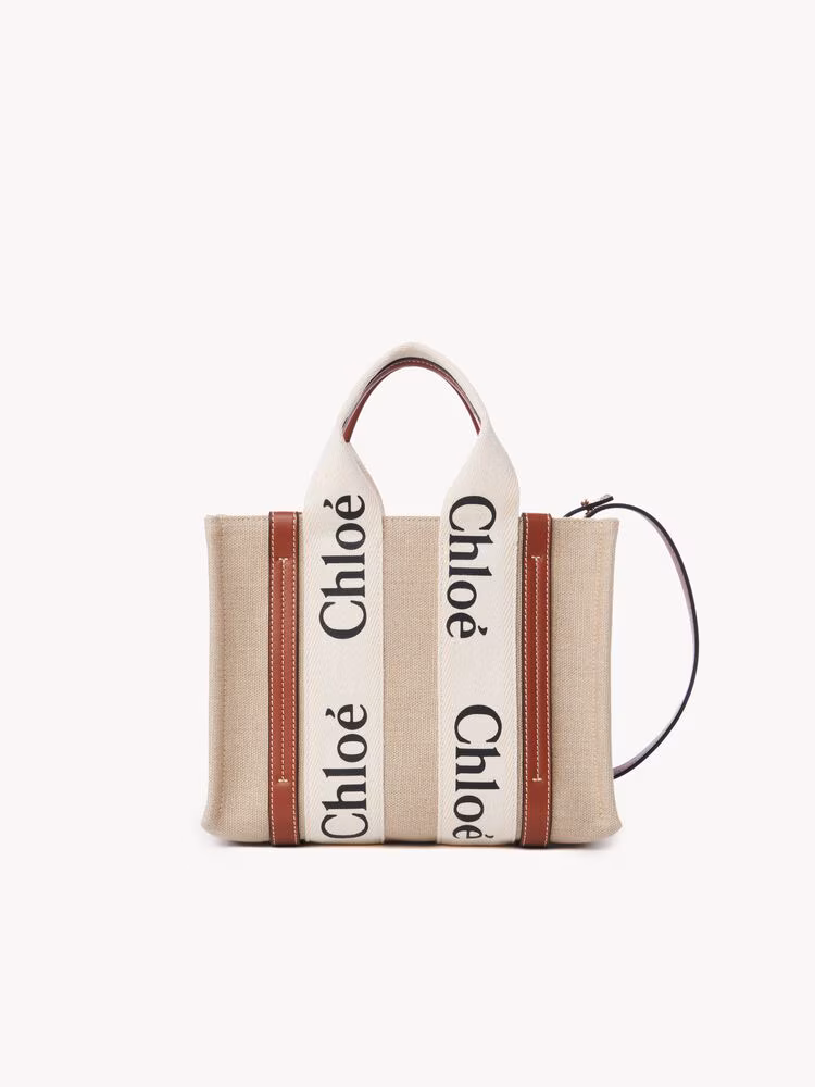 The Chloé Small Woody Tote Bag in linen canvas and calfskin is a lightweight, versatile bag designed for everyday elegance. Featuring signature logo detailing, a removable strap, and spacious interior, it’s crafted with eco-conscious materials for a refined yet responsible style.