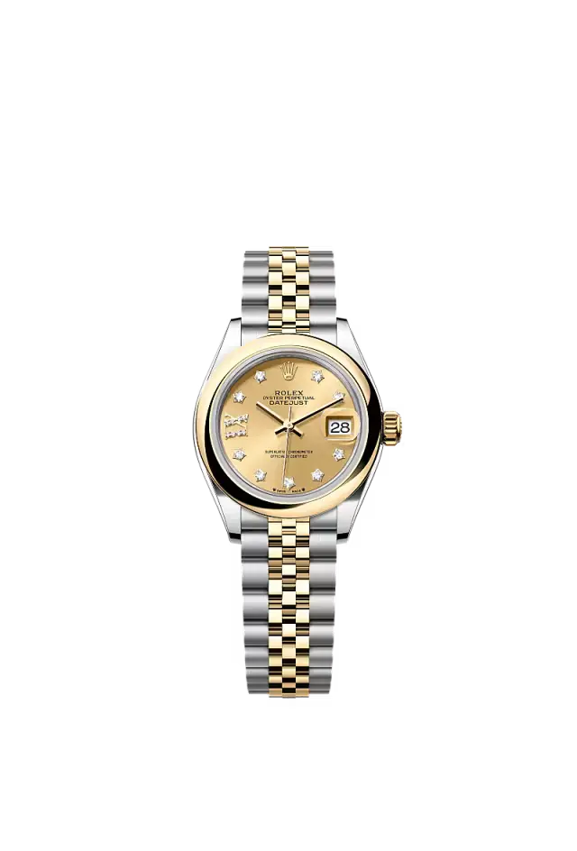 Experience the pinnacle of feminine horology with the Rolex Lady-Datejust 28. This exquisite timepiece combines the strength of Oystersteel with the warmth of 18k yellow gold Rolesor for a truly luxurious presence. Its breathtaking mother-of-pearl dial, unique by nature and set with brilliant diamonds, ensures no two watches are exactly alike. Cased in the iconic 28mm Oyster architecture, featuring the signature fluted bezel and secured by the supple Jubilee bracelet, this watch is powered by the precise Manufacture Calibre 2236. It is a certified Superlative Chronometer, offering unwavering accuracy and timeless elegance—the perfect heirloom for the modern woman.