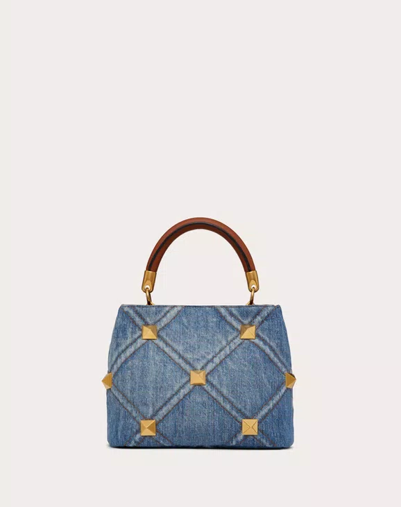 Iconic Denim Valentino Roman Stud Top Handle Bag with Maxi Stud Embellishments
